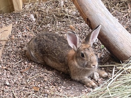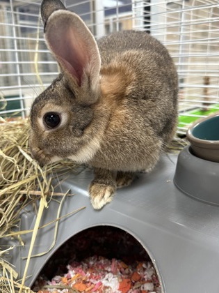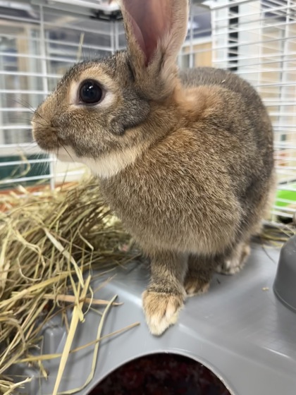 Taiga came to us from a hoarding situation and has truly blossomed. These days she greets her caretakers with morning excitement and politely insists on pets before breakfast-gently nudging your hand and "purring" with soft tooth chattering when she's content. Once she feels secure, she'll happily take treats and leafy greens from your hand, keeps a tidy space, and settles into a calm routine. Taiga would make a wonderful companion for both first-time rabbit guardians and experienced folks alike, especially in a peaceful home where her growing confidence can continue to shine.