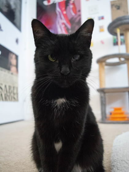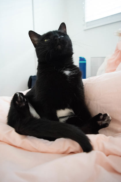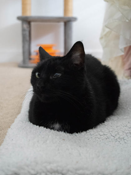 After one month, her personality has shown so much. She is a sweet, calm girl who loves her personal space, but during her affectionate hours she will invade our space just to get a few pets from us. She enjoys being in our company, especially on the bed, which has now become her favorite nap spot (an upgrade from the cold floor). She used to hiss a lot, but we learned that she only did so when she was overstimulated or had her boundaries crossed. We are continuing to learn more about her day by day, and we're hoping she can find the perfect owner soon!