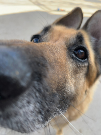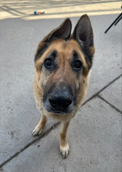 Hi there, I'm Ziva, an 87-pound German Shepherd mix who's enjoying life at her own steady pace. I'm a bit of an old lady these days and prefer to explore and do my own thing rather than chase toys around. Food and treats, though? Those definitely have my attention. I know my name, even if I sometimes choose when to listen, and I'm not shy about speaking my mind with a little old-lady howl now and then. New environments can make me a bit anxious, and you might see me pacing while I take everything in, but I truly love being outside where I can watch the world go by. I'm fairly independent and don't always seek out attention, but that doesn't mean I'm not sweet-I just show my affection in quieter ways. I move a little stiffly and may have some sore hips, so keeping me comfortable with joint supplements and regular, gentle exercise would really help me feel my best. I'd be happiest in a calm, easygoing home where I can enjoy my independence, get my daily walks to keep my joints moving, and relax knowing I'm safe. At the end of the day, I'm a gentle, loving girl who just wants a peaceful place to call home.
