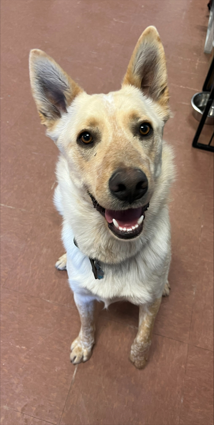Hi there, I'm Caspian, a 50-pound Shepherd and Red Heeler mix with a gentle heart and a soft, thoughtful approach to the world. New places and unfamiliar people can make me a little cautious at first, but with slow, kind introductions I warm up quickly and start leaning on my person for comfort and reassurance. I don't love being too far away from the people I trust, and when I'm feeling unsure, I may gently hop up to stand against you or even try to sit in your lap just to be close and feel safe. I know my name, I'm very curious despite my nerves, and I'm a big fan of food and tasty bones, which helps make learning and bonding extra fun. I can be easily spooked by sudden movements or raised objects, and I might flinch or cower when something surprises me, so I really need a calm, patient home that understands my sensitivities. I'd thrive in an active family who can keep me engaged, but who's also willing to start off low-key and let me settle in at my own pace. With plenty of reassurance, confidence-building, and lots of love, I know I'll blossom into an incredibly loyal, affectionate companion.