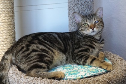 Snicker Doodle is a young tabby boy with a velvety-soft coat and the gentlest heart. He's a little shy at first, especially since one of his eyes has partial sight, but don't let that fool you - underneath that cautious exterior is a deeply affectionate companion just waiting to feel safe.