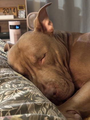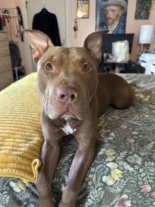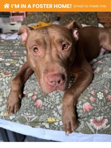 Whiskey's foster describes him as "goofy, affectionate, and endlessly entertaining." He's a total cuddle bug who loves being near his people - whether he's snoozing on the bed, leaning in for full-body hugs, or curling up for movie night. Inside the home he's calm and polite; outside, he's curious, alert, and excited to explore the world with a happy tail and bright eyes.