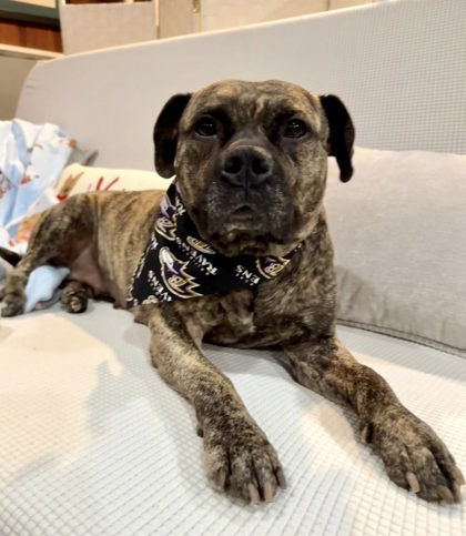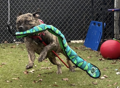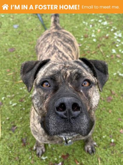 Meet Trek! She is a 4-year-old, 60-pound brindle beauty with a big heart, big energy, and an even bigger love for her people. She can appear a little shy when first meeting her in a kennel setting, but don't let that fool you-once she's out and able to relax, her happy, affectionate personality shines through.