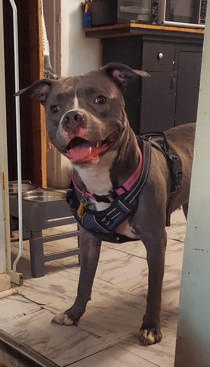 She rides excellent in the car. She sits in the front seat and looks forward like she's your copilot. She gets along very well with other dogs, even if the other dog is a stinker, she retains her sweet personality. She is so gentle. She will walk up and give you kisses. She loves attention and being pet. She's working on her housetraining skills and only has trouble at night sometimes. She would be good with children. She's really a wonderful dog.