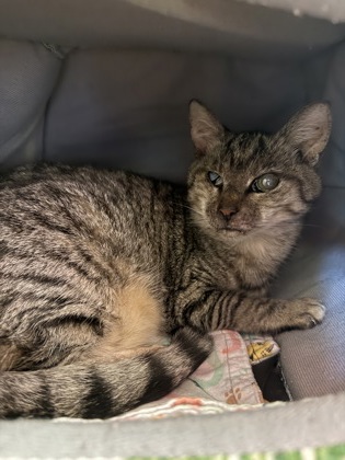 Sweet little Dove got her name because of the little trill she makes when she's happy. And she'll be happy a lot if you give her a loving home! She really enjoys it when you pet her and show her affection, and she'll purr to let you know. She's a grey and black Domestic Short Hair mix, about 16 years. She loves people and loves to play with toys. She's blind in one eye, probably from an injury, but she doesn't let it slow her down at all -- she has a great disposition and loves life. She'd probably do best in a home where she's the only cat, and would probably do well with older children. If you'd like to give a sweet cat a second chance, please come see our little Dove!
