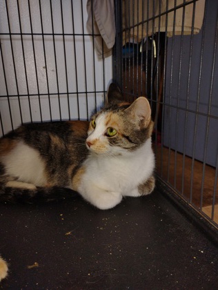 Lucky came to the shelter stary and pregnant in July 2025. She had her babies on July 19, 2025. Her kittens are Peanut, Twister, Cliff, Norma, and she is the surrogate mother to Roland. She is a great mother, and a fierce mother.