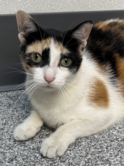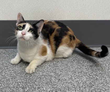 Derby is a fun calico girl who loves to play-especially with her favorite spring toy! At 1 year old, she's an adult with a youthful spirit and a whole lot of personality. She can be a little sassy at times, but it's all part of her charm. With her gorgeous green eyes, this pretty kitty is patiently waiting for the right person to take her home and fall in love.