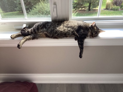 Mama cat is ready to find her forever home. Her kittens have all been adopted, and she has been spayed. She enjoys spending time on the window ledge, quietly watching the world go by.