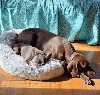 She's gaining confidence with the doggy door, enjoys watching her foster sibling play, and loves being part of the household rhythm. She's not 100% housebroken yet, but she's making progress - Suki has been letting herself out the last two days for potty breaks! She responds well to routine and gentle guidance.