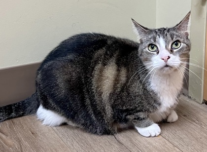 I am a 2-year-old tabby gal with a soft spot for cozy spots and gentle company. I might be a little shy when we first meet, but give me some time and I'll turn into your loyal little shadow, quietly following you from room to room. One of my favorite quirks? I'm a self-petter! I'll rub my head against your hand, arm, or leg to show affection in my own special way - it's pretty adorable if I do say so myself. I love to play fetch with pom poms, chase laser pointers, and scratch on cardboard boxes, and exploring cat houses. I'm litter box trained and perfectly content to entertain myself when you're busy, so no worries about separation anxiety here.