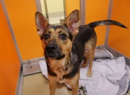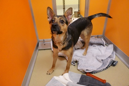 Now this little family is ready to find homes of their own. DJ is estimated to be between 1-2 years old and is thought to be some sort of Shepherd mix, however her exact breed makeup is unknown. She is a perfect medium sized gal and weighs about 50 pounds even! She would love to be in a home where she can spend time with her people, go on walks, and overall just learn how to be a "regular dog". She may enjoy having a canine companion in her new home. Cats are unknown at this time.