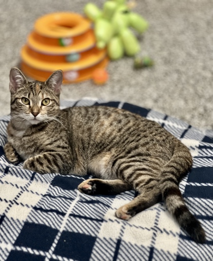 Penny is a gorgeous, petite tabby with just a touch of orange on her forehead. Penny was born March 2025 and is ready to find her forever home. Penny has always been a very sweet, calm kitten and would be great in a home with another kitty. She loves to play with her buddies then curl up in a purr pile. She likes to come to you for pets and being held but we are confident, once in her forever home, she will quickly become completely relaxed. If you're looking for an adorable little snuggle buddy, Penny might just be the one for you.