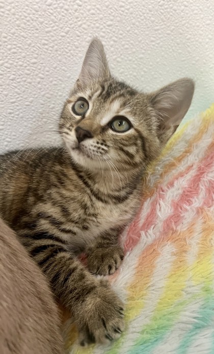 Wowza! This little kitten is about as cute as they come and just as sweet. Her name is Pip. She was found running in the middle of a busy highway and one of our fabulous volunteers brought her in and took care of her until we could fit her into our shelter. Her eyes will just melt your heart and her purr will soothe your soul. We are in love with this confident, fun, beautiful little nugget. If you're looking for a snuggly, friendly and adorable kitten, get your applications in!