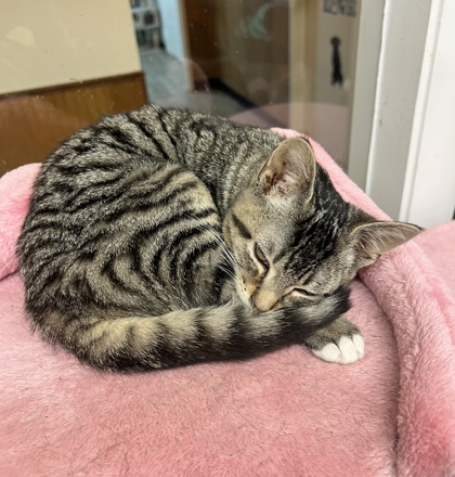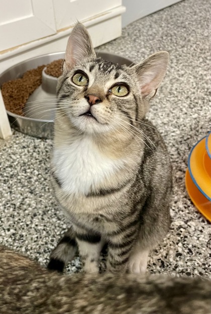 Scruffy is one of five bottle-fed kittens who were lovingly raised by a dedicated staff member. She is almost identical in appearance to her sister, Cinnamon, but without the dusting of light brown color. However, this young lady is her own personality. She is inquisitive and affectionate. She would make a wonderful addition to your family! Scruffy is tiny but mighty, and her purr can be heard across the room as she cuddles in a kitten pile with her family or in a human's arms.