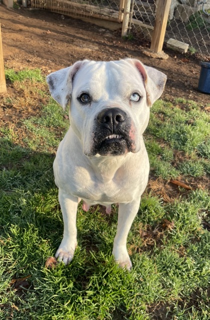 Joy is four years old. She looks to be an American bulldog/boxer mix. She is medium size. Joy loves everyone she meets. She loves adults, children, dogs and cats. Joy is housetrained. She has a calm and steady demeanor. Joy is an easy leash walker, no pulling, just simple strolling. She loves sniffing and takes her time to enjoy all the goodness and kindness out there. Joy travels well. She loves pets and scratchies. Joy holds no grudges and is grateful for every gentle pet and attention she receives. If you are looking for a Velcro dog, a loving and happy companion to walk through your days with and share your life, Joy is an absolute gem. She will enjoy long walks or hikes, lunches with friends, a comfy couch to watch TV, a sunny porch to enjoy the scenery and the quiet companionship of her person. We have fallen so in love with this pup. Whoever adopts this pretty girl with the soulful eyes (one brown and one blue) and speckled ears will be so lucky. Get your application in for Joy if you are looking for the dog of a lifetime. She will be a wonderful addition to any home.