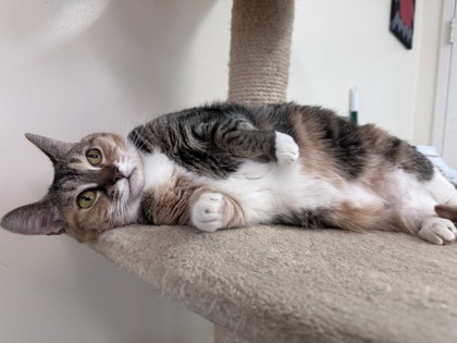 If you're looking for a quiet, mature kitty then look no further than Amber. She is a lovely cat. with gorgeous coloring and markings. Amber is super friendly and calm. Her quiet purr is so soothing. Amber's mom became homeless and could no longer care for her. A Good Samaritan made sure Amber is fully vetted and she's already spayed. Thankfully we had room at our shelter for her to be safe and loved as we search for her forever home. Amber gets along with everyone and is a perfect little gem. She loves other cats and made the transition to our community cat room without a blink. She'd do great in a home with other kitties (most likely friendly dogs too) or as a single girl.