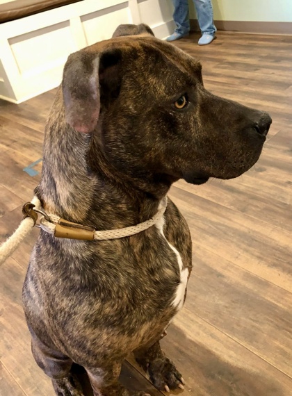 Boone is an absolutely stunning young dog. We rescued him from a high kill shelter. We think Boone is a Plott hound mix, possibly Tennesee Treeing Hound based on his overall looks and ears. He came in to us as an older puppy and sadly, he is still with us after over five years. Boone is just over 5 1/2 years old and is 57 lbs of muscle and heart.
