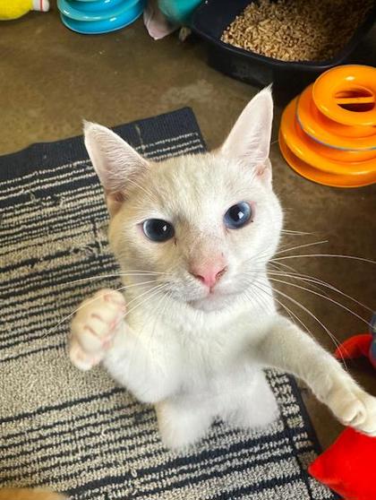 Meet Ford, a breathtakingly beautiful white cat with a personality as vibrant as his striking looks! With his snowy coat and piercing blue eyes, Ford is impossible to ignore-and he knows it. But don't worry if his stunning appearance doesn't grab you right away; this silly guy has plenty of charm to win you over! Ford adores being the center of attention and will happily steal the spotlight whenever he gets the chance. Whether he's perched atop the cat tree or gazing out the window he never hesitates to be the king of the cattery! His favorite part of the day? Breakfast! The moment his bowl hits the floor, Ford is the first to scurry over, eagerly awaiting his meal. This clever guy has even mastered the treat puzzle with ease, proving that he's as smart as he is charming. We have no idea how someone hasn't scooped him up yet!