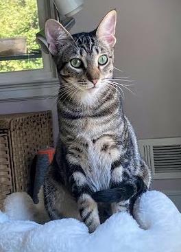 I can be a little shy with sudden movements and loud noises, so I'll do best in a quiet home without children. I may hide at first, but a feather toy or snack will coax me out in no time. Once the game is on, I'm fearless and lightning fast-whether I'm hunting my favorite window-mounted feather toy or climbing all the way up the tallest cat tree.