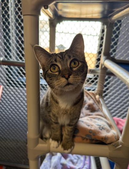 This sweet little girl is as lovable as they come. Eggo is playful, curious, and full of kitten energy, but she also loves a good cuddle once she's tired out from her adventures. She's the perfect mix of spunky and sweet, and her adorable personality shines brighter every day.