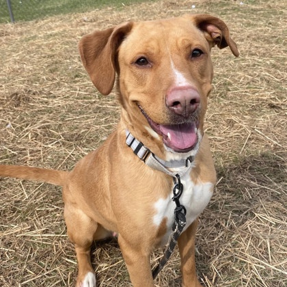 While this Vizsla mix enjoys running for much of her walk, but knows to stop for for pictures, treats, and when her running buddy needs a break. She knows "sit" and is getting better every day about sitting politely for her favorite snacks (which she absolutely adores). Nova is very people-friendly and enjoys affection - especially after she's had a chance to burn off some of her zoomies. She doesn't mind the cold or snow either, making her a great year-round adventure buddy.